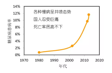 以前,快病比较多,治疗也相对来说比较简单;而现在,世界多个国家的慢性疾病发病率逐年上升。1980年,我国糖尿病发病率大概只有0.7%,平均一百个人中只有不到一人患病;而到了2013年,糖尿病的发病率已经达到了11.6%。慢性疾病也成为了人们身体内潜在的一大健康风险。